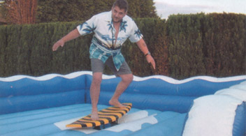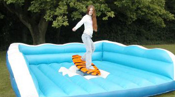 A "real" big attraction at any venue nowadays, making the Surfboard/Snowboard Simulator a guaranteed success. The closest thing to the real thing! Now you can experiment with the newest and coolest thing in the Surfing/Snowboarding world. The mechanised board is surrounded by a large soft air filled mattress. The rider steps up onto the board and hopes to stand up for as long as possible mimicking the sleek movements of a Hawaiian surfer and an extreme snowboarder. The control is by an operator who has several controls relating to spin speed, sideways-buck, and roll directions. This activity can also be used in a water surround with some modifications to the base.